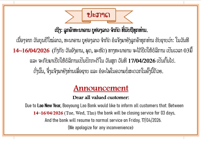 ເຖິງ: ລູກຄ້າເງິນຝາກ ທະນາຄານ ບູຢອງ ລາວ ຈຳກັດ